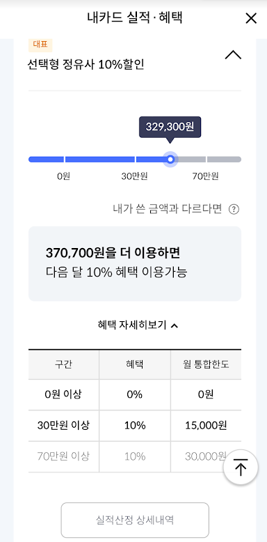 만약 기름을 5만원 넣었다면 5천원이 카드 결제일에 제외되고 4만 5천원이 청구되는 형태인데요. 10%면 꽤 큰 할인폭이라고 생각들지만 사실 당연하게도 월 할인 한도가 있습니다. 전월 30만원 이상이면 월 할인 한도가 1만5천원, 70만원 이상이면 3만원입니다. 즉 카드를 아무리 많이 사용해도 3만원까지만 할인받을 수 있습니다.