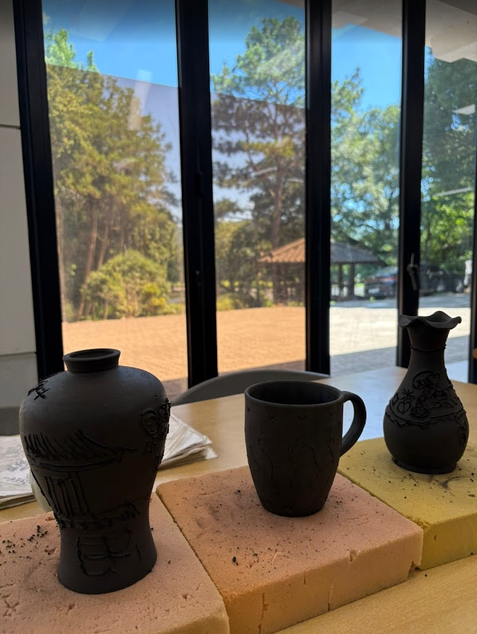 도자기를 직접 만드는 체험은 아니고 굽기 전의 모양이 완성된 도자기, 접시, 머그컵 중 하나를 골라서 무늬를 새겨 보는 작업이고 끝나면 나중에 청자로 구워서 택배로 보내준다고 하네요. 저희 가족은 각자 원하는 자기 골라서 하나씩 맡기고 왔습니다. 가격은 모양 따라 조금 차이 나지만 개당 1.5~2.5만원 정도 했어요.